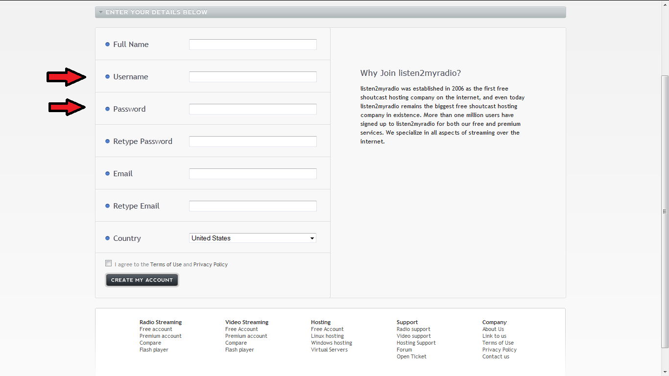 2. Δημιουργούμε λογαριασμό (SIGN UP FOR free acount) στη σελίδαwww.listen2myradio.com .