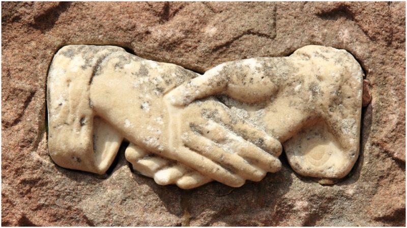 Στην Ακρόπολη των Αθηνών, σε μια πέτρινη πλατεία του 5ου π.Χ. αιώνα, απεικονίζεται η Ήρα και η Αθηνά να δίνουν τα χέρια.
